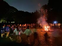 1日目は、創作活動で【焼きプレート】作りを行い、思い思いの言葉や図形を糊で描き、バーナーで表面を炙ってすてきなプレートを作成できました。午後からは、シェアリングネイチャー協会の方に来ていただき、敷地内の林の中でネイチャーゲームを行いました。ヒントカードをもとに隠された生きものを当てるゲームなど、自然を使った様々なゲームを楽しみました。1日目の最後には、キャンプファイヤーを行い、すっかり日が落ちて暗い中で、燃える炎の明かりを囲んで、川原代小の子たちを一緒に特別な時間を過ごしました。