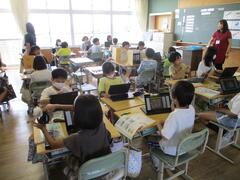4年生は、英語専科田代先生の授業で外国語活動を行いました。最初に動画を見ながら歌や複数形の単語の発音練習を行い、次にそれを使った友だちとの会話を練習しました。クロームブックを使って、友だちにプレゼントする鉛筆や消しゴム、定規などの組み合わせをつくり、ペアで会話の練習を行いました。はじめは恥ずかしそうにしている子もいましたが、最後には、みんな笑顔で外国語活動を楽しんでいました。