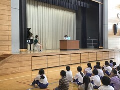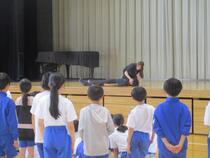 城西中学校吹奏楽部の皆さんが、出前演奏会に来てくれました。「崖の上のポニョ」「名探偵コナンのテーマ」「RPG」など、子供たちも聞き覚えのある曲を演奏してくれました。子供たちは、手拍子をしたり体でリズムをとったりしながら、演奏を楽しんでいました。また、吹奏楽部には馴柴小の卒業生も多数在籍し、演奏終了後には関わりのあった先生方との再開を楽しんでいました。気温が高く暑さが心配される中でしたが、卒業生の活躍する姿も見られ、とても楽しいひとときになりました。