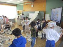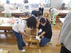 この授業ではのこぎりや金づちを使用するため、子供たちの安全のために、保護者のボランティアの皆さんに協力いただきました。
