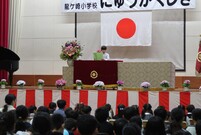 その後、1年生の代表児童が教科書給付を受け、6年生代表挨拶に移りました。代表の児童は、「龍小には、明るくて優しいお兄さん、お姉さんがいます。心配なことや分からないことは教えてあげます」と優しく声をかけ、さすが最高学年と感心しました。