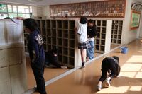 午後からは、明日の入学式準備。5年生たちが、昇降口とその周辺、1年生のくつ入れ、1年生教室前廊下など、丁寧に掃除をしてくれていました。6年生は、式場準備で、赤じゅうたんの花道の設置や保護者席の設置、花設置、駐車場の落ち葉掃きなど、精力的に活動していました。始業式に校長が話をした「みんなで生きる(共生)」、「役に立つ(貢献)」を実行してくれ頼もしかったです。