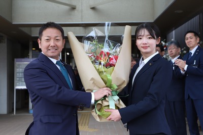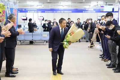 市役所玄関ホールに集まった市民の皆さんや市職員が大きな拍手で出迎えるなか、笑顔で花束を受け取り、2期目の市政がスタートしました。